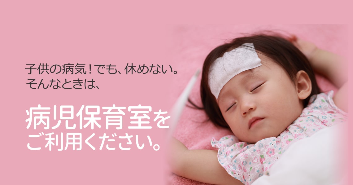 病気やケガのお子さんを、仕事等で休めない親御さんにかわって、 保育、ケアする施設です。